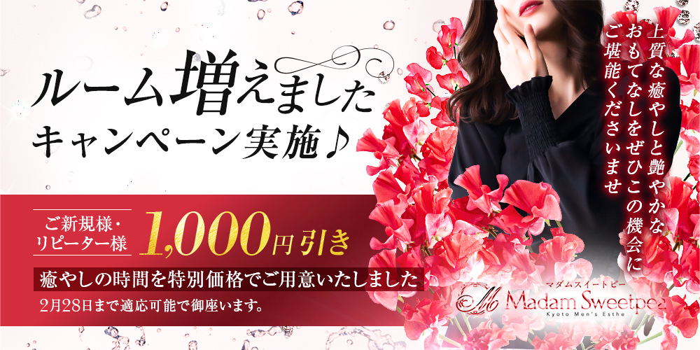 2026/01/14 ルーム増えましたキャンペーン実施♪ ルーム増えましたキャンペーン実施♪ ご新規様・リピーター様1000円引き 癒やしの時間を特別価格でご用意いたしました。 2月28日まで適応可能で御座います。 上質な癒やしと艶やかなおもてなしをぜひこの機会にご堪能くださいませ